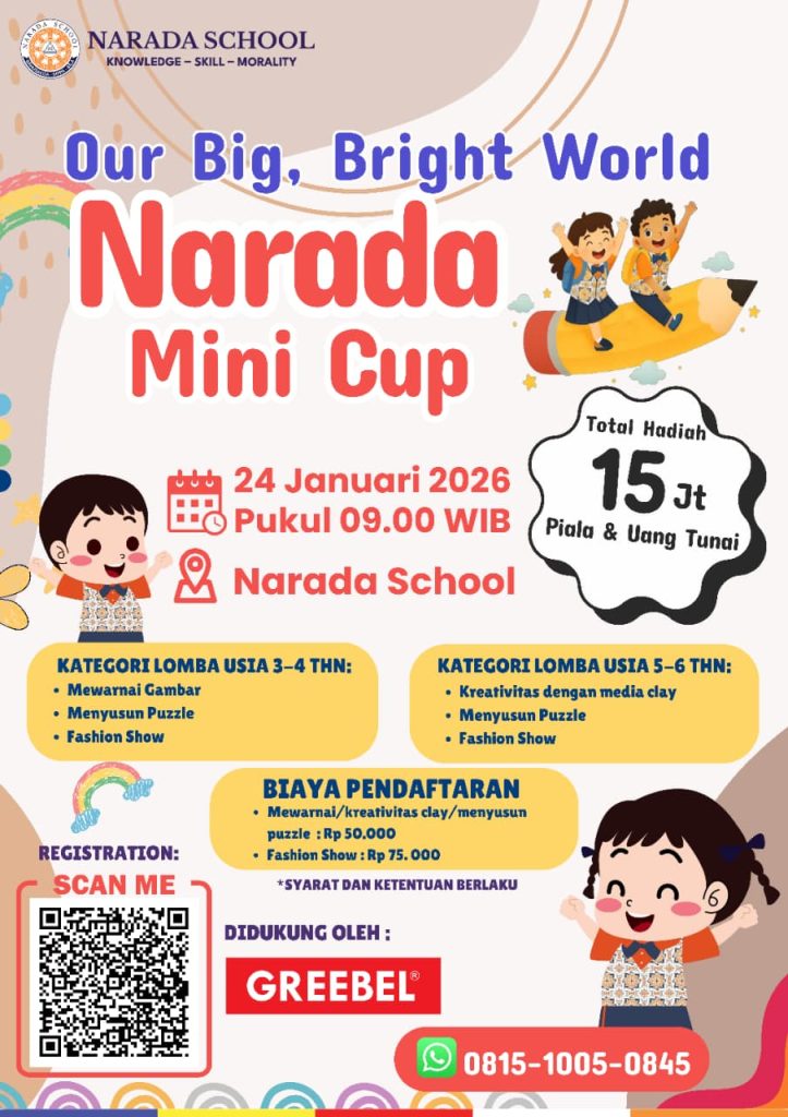 NARADA MINI CUP 2026 Sabtu, 24 Januari 2026TERBUKA UNTUK UMUM! Narada Mini Cup mengundang anak-anak untuk mengekspresikan bakat mereka melalui berbagai kompetisi yang seru dan bermakna: Lomba Mewarnai (Usia 3–4 tahun) Lomba Menyusun Puzzle (Usia 3–4 tahun & 5-6 tahun) Kreativitas Tanah Liat (Clay) (Usia 5–6 tahun) Fashion Show (Usia 3–4 & 5–6 tahun) Total hadiah 15 juta rupiah, piala […]